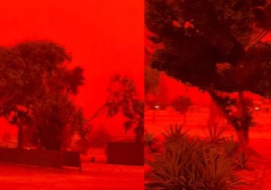 جس نے شہریوں کو خوف اور حیرت میں مبتلا کر دیا۔رپورٹس کے مطابق یہ غیر معمولی منظر اس وقت دیکھنے میں آیا جب سائیکلون  ناریلے  کے زیرِ اثر تیز اور طوفانی ہوائیں چلیں۔ ان ہواؤں نے زمین سے آئرن آکسائیڈ سے بھرپور سرخ مٹی اور گرد کو فضا میں بلند کر دیا، جس کے باعث چند ہی لمحوں میں دن کی روشنی مدھم ہو گئی اور پورا آسمان سرخ اور نارنجی رنگ میں ڈھل گیا۔
