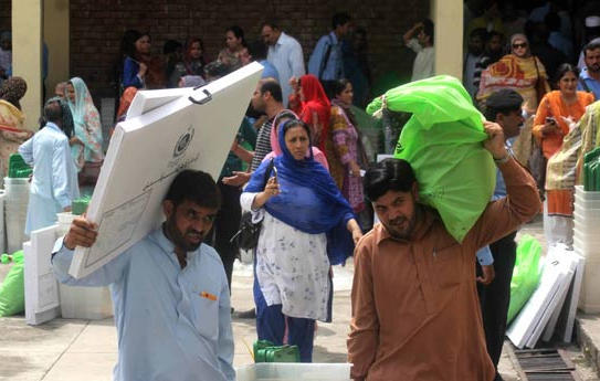 کل کے انتخابات کے لیے انتخابی مواد پریزائیڈنگ افسران اور پولنگ عملے کے حوالے کیا جا رہا ہے.