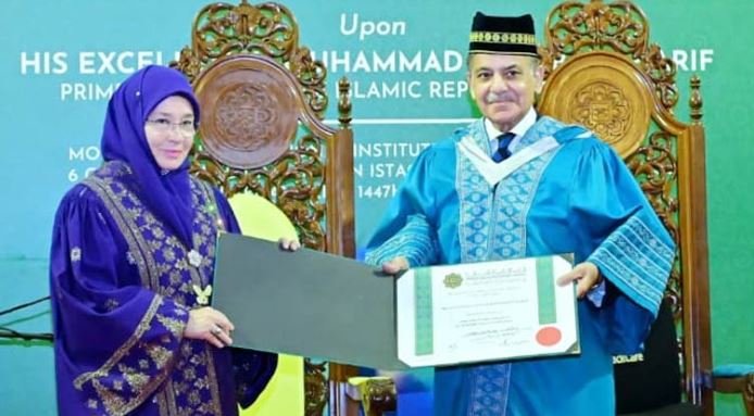 Prime Minister Muhammad Shehbaz Sharif receives an Honorary Doctorate Degree in Leadership and Governance from the International Islamic University Malaysia (IIUM).