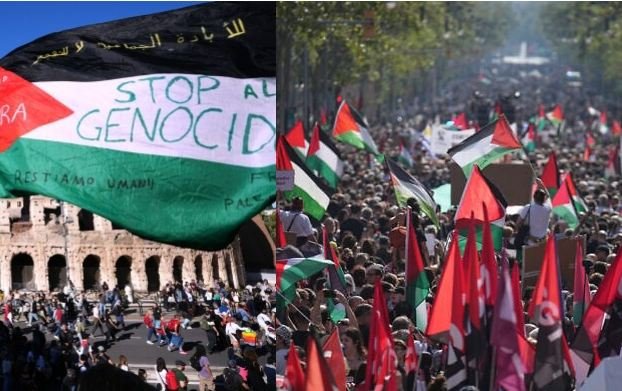 فرانس کے دارالحکومت پیرس** میں بھی ہزاروں شہری سڑکوں پر نکل آئے۔ مظاہرین نے اسرائیلی جارحیت کی شدید مذمت کی اور مطالبہ کیا کہ عالمی طاقتیں خاموش تماشائی بننے کے بجائے فلسطینی عوام کے تحفظ کے لیے فوری اقدامات کریں۔ اسپین کے شہر بارسلونا میں ہونے والے مارچ میں مظاہرین نے فلسطینی آزادی کے حق میں نعرے لگائے اور غزہ میں اسرائیلی حملوں کو جنگی جرم قرار دیا۔دوسری جانب اٹلی کے دارالحکومت روم میں احتجاج کا سلسلہ مسلسل چوتھے روز بھی جاری رہا۔ شہریوں نے مطالبہ کیا کہ اطالوی حکومت اسرائیل کے ساتھ تعلقات پر نظرثانی کرے اور فلسطینیوں پر ظلم کے خلاف واضح مؤقف اپنائے۔