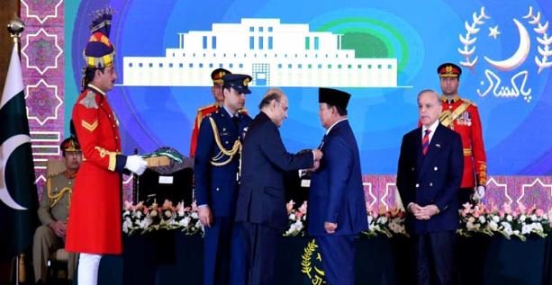 اردوورلڈکینیڈا( ویب نیوز)اسلام آباد میں ایوانِ صدر میں ایک خصوصی تقریب کا انعقاد کیا گیا جس میں انڈونیشیا کے صدر ابوووسوبیانتو کو پاکستان کی جانب سے اعلیٰ ترین اعزاز نشانِ پاکستان سے نوازا گیا۔ تقریب میں صدر پاکستان آصف علی زرداری کے علاوہ وزیراعظم، چیئرمین سینیٹ، اسپیکر قومی اسمبلی اور اعلیٰ عسکری قیادت بھی موجود تھی۔
