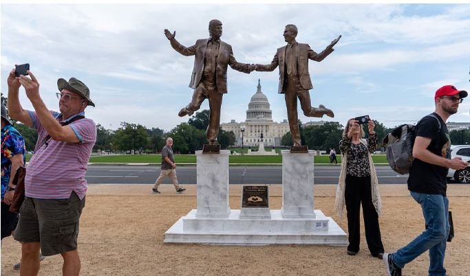 اردو ورلڈ کینیڈا ( ویب نیوز ) امریکی دارالحکومت واشنگٹن کے نیشنل مال (National Mall) میں حال ہی میں ایک ایسا مجسمہ نصب کیا گیا جس نے چند ہی گھنٹوں میں شدید تنازع کھڑا کردیا۔ یہ مجسمہ امریکا کے موجودہ صدر **ڈونلڈ ٹرمپ** اور بدنام زمانہ سرمایہ کار و مجرم **جیفری ایپسٹین** کو ہاتھوں میں ہاتھ ڈالے، مسکراتے ہوئے دکھا رہا تھا۔